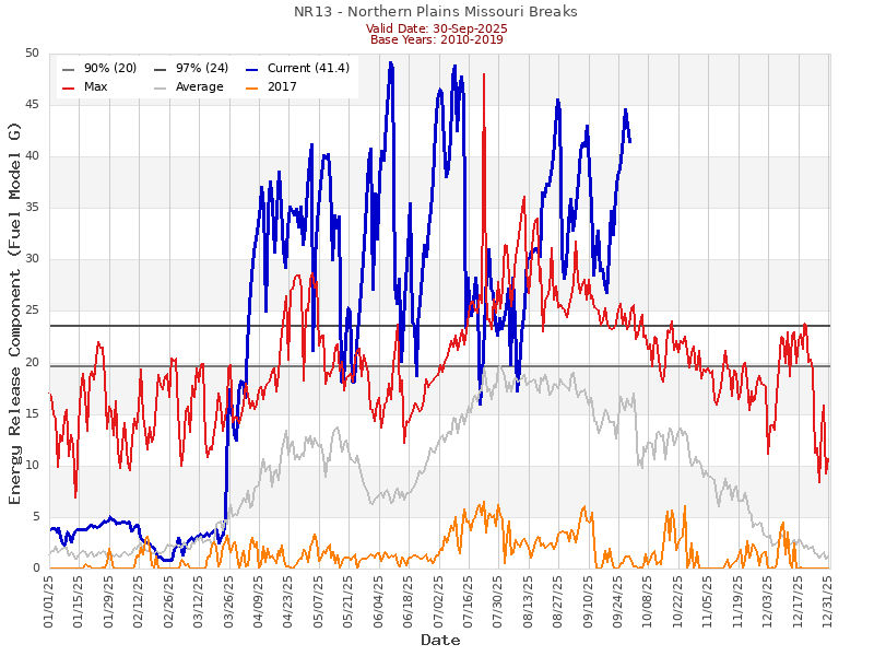 · Energy Release Component: A number related to the available energy (BTU) per unit area (square foot) within the flaming front at the head of a fire. Daily variations in ERC are due to changes in moisture content of the various fuels present, both live and dead. Since this number represents the potential “heat release per unit area “in the flaming zone, it can provide guidance to several important fire activities. It may also be considered a composite fuel moisture value as it reflects the contribution that all live and dead fuels have to potential fire intensity